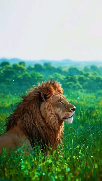 a man standing on top of a lush green hillside under a blue sky filled with birds