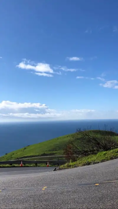 an empty road near the ocean with mountains in the background and flowers growing on the side