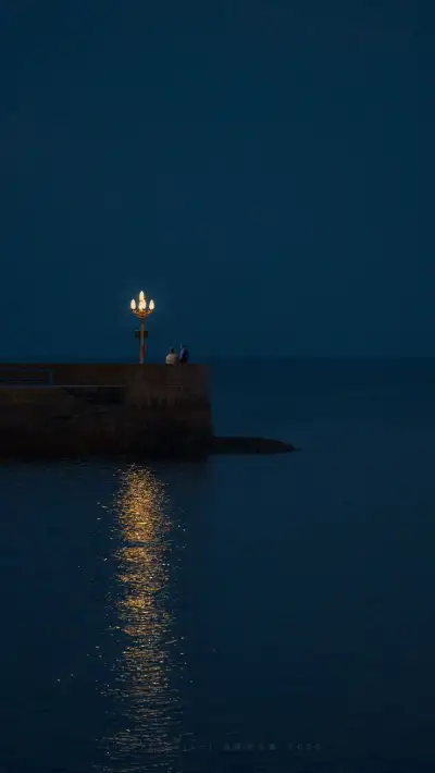 two people sitting on a pier at night with the moon in the sky above them