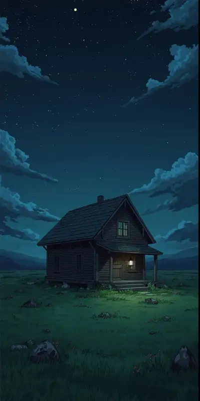 a house sitting on top of a lush green field under a night sky