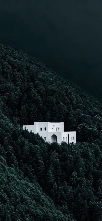 a white house sitting on the side of a lush green forest covered hillside under a dark sky