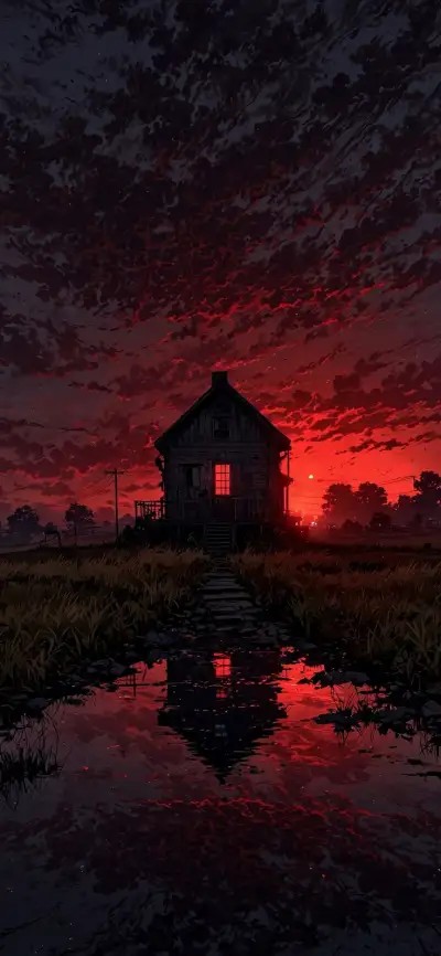 a house sitting on top of a lush green field under a red sky with clouds