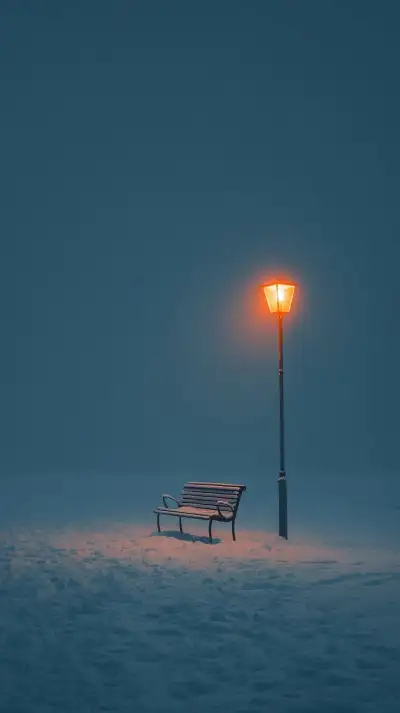 a park bench sitting under a street light in the middle of snow covered ground at night