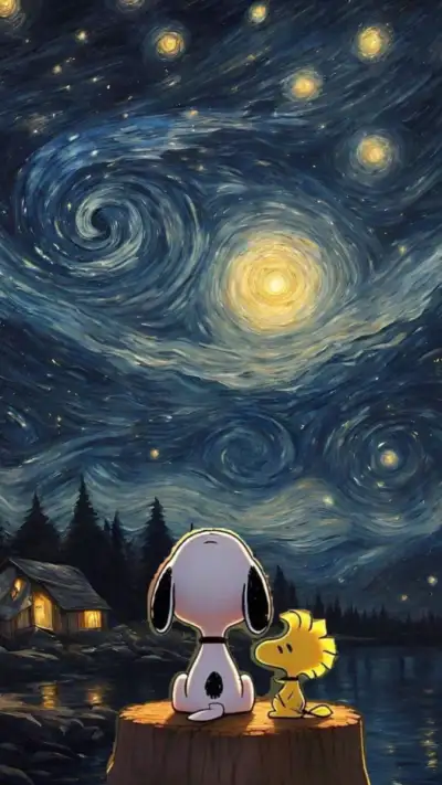 snoopy sitting on a stump looking at the stars