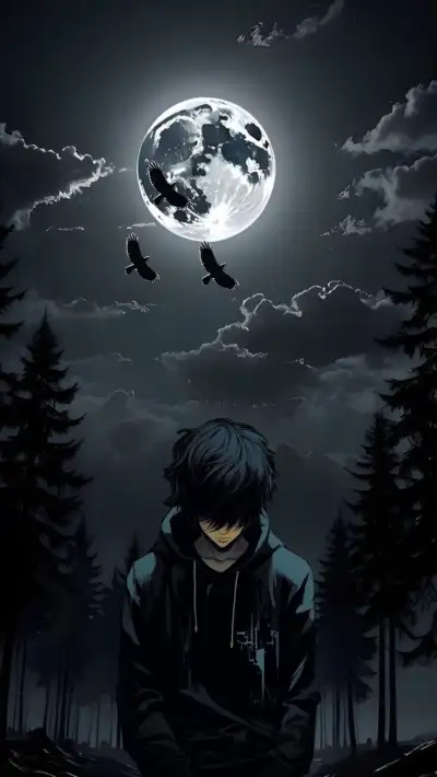 a man sitting in front of a full moon with two birds flying over his head
