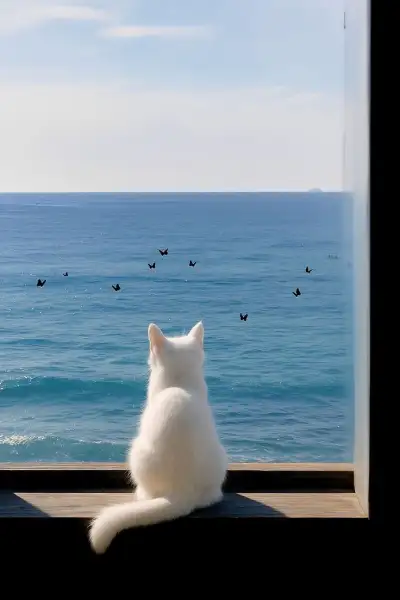 a white cat sitting on top of a window sill looking out at the ocean