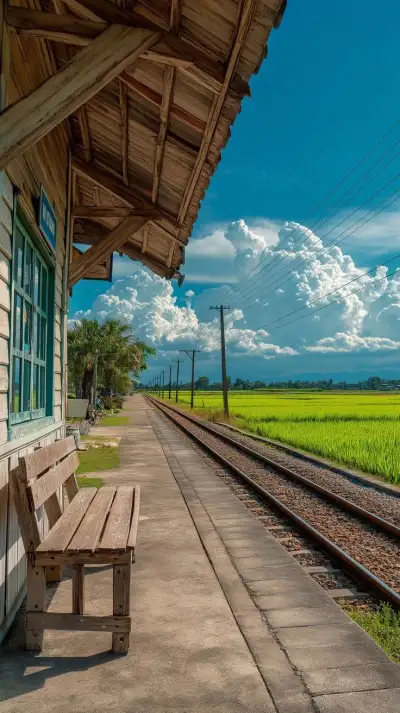 a wooden bench sitting on the side of a train track next to a green field