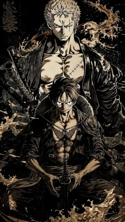 two anime characters sitting on top of each other with swords in their hands and water splashing around them