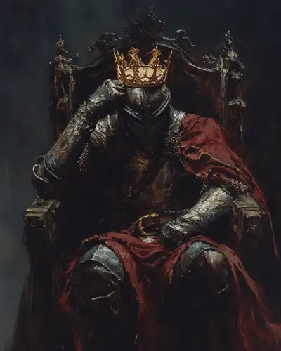 a painting of a knight sitting in a chair with a crown on it's head