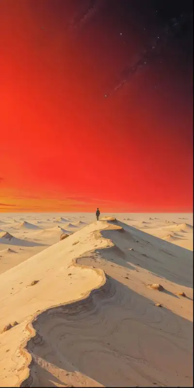 a man standing on top of a sandy dune under a red sky with stars in the distance