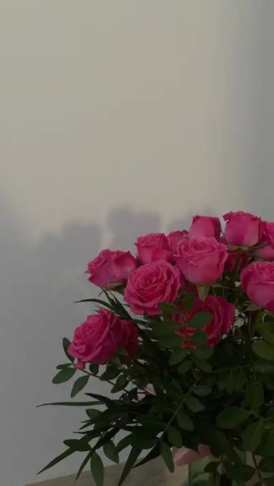 a vase filled with pink roses sitting on top of a wooden table next to a white wall