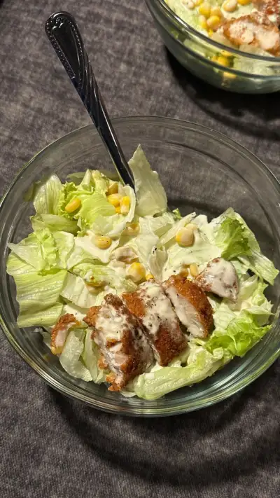 two glass bowls filled with salad and meat on top of a table next to each other