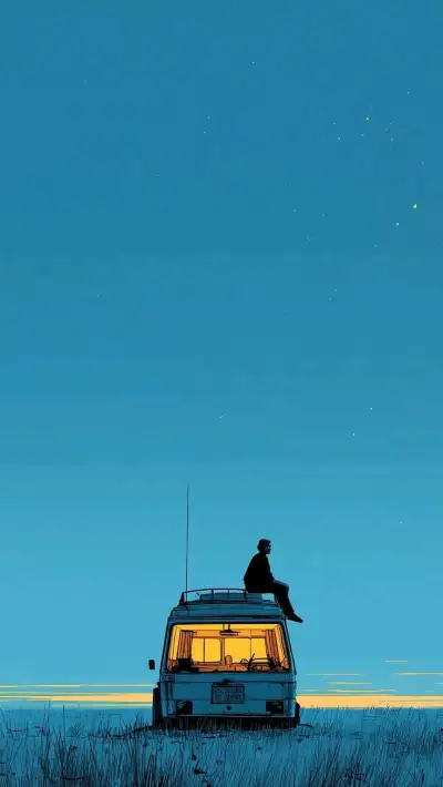 a man sitting on top of a yellow van in the middle of a field at night