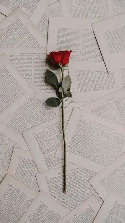 a single red rose sitting on top of an old book page covered in pages that have been folded down