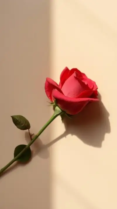 a single red rose sitting on top of a white table next to a shadow cast wall
