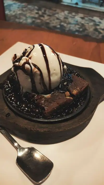 a chocolate dessert with ice cream on top