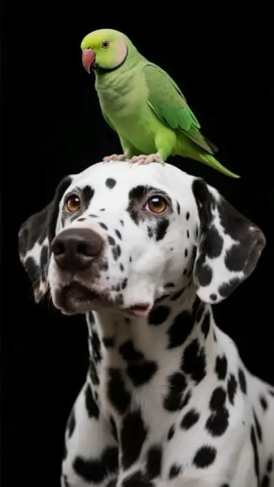 a green parrot sitting on top of a dalmatian dog's head,