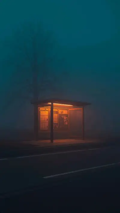 an empty bus stop on a foggy night