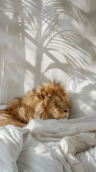 a lion laying on top of a bed covered in white sheets