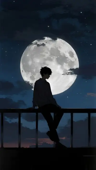 a person sitting on a railing looking at the moon in the sky with clouds and stars