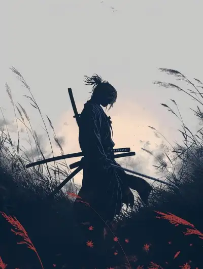 the silhouette of a person holding two samurai swords in front of tall grass and flowers