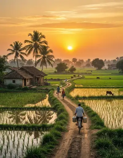 two people riding bikes down a dirt road in front of rice fields with cows grazing on the other side