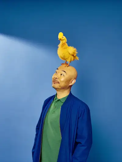 a person wearing a hoodie with sunglasses on their face, sitting against a red and white wall