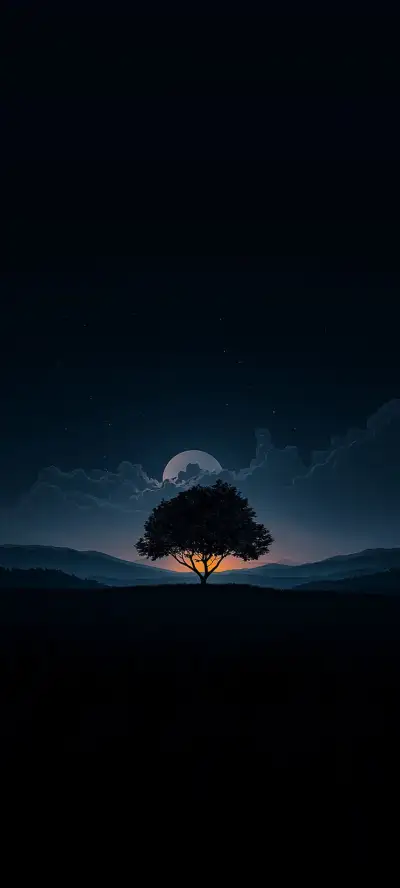 a lone tree is silhouetted against the night sky as the sun sets in the distance