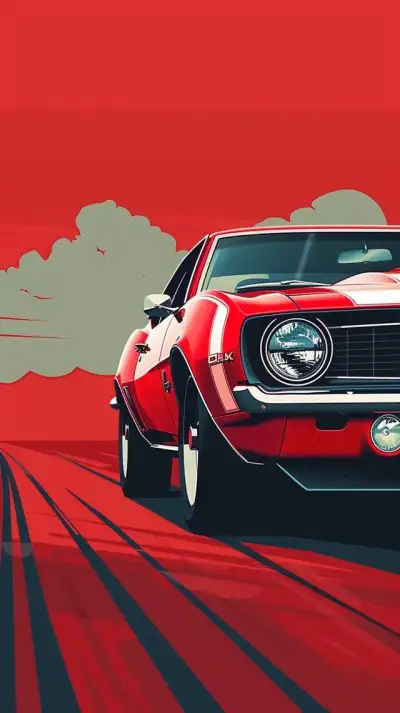 a painting of a white mustang driving down a country road in front of trees and clouds