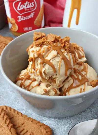 a bowl filled with ice cream next to cookies and a bottle of soft drink in the background