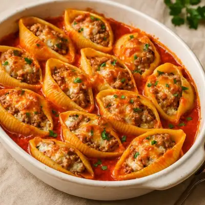 a white dish filled with stuffed shells covered in sauce and meat, garnished with parsley