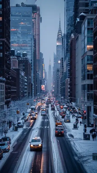 a city street filled with lots of traffic next to tall buildings and snow covered ground