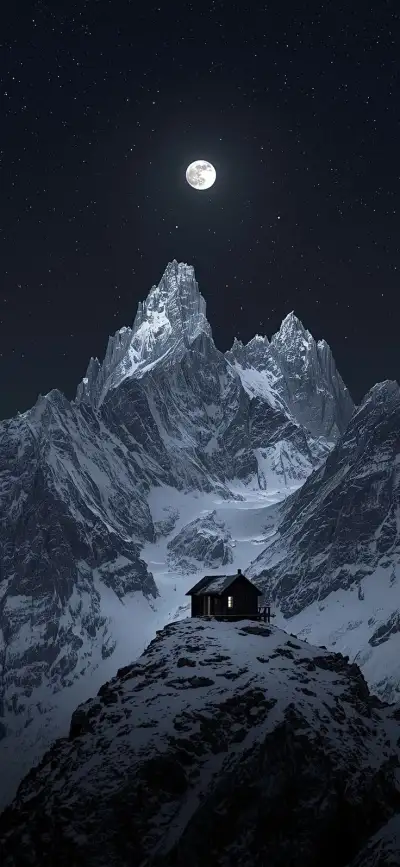 a cabin on top of a snowy mountain under a full moon and star filled sky