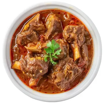 a white bowl filled with beef stew and garnished with parsley