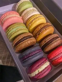 a box filled with lots of different colored macaroons