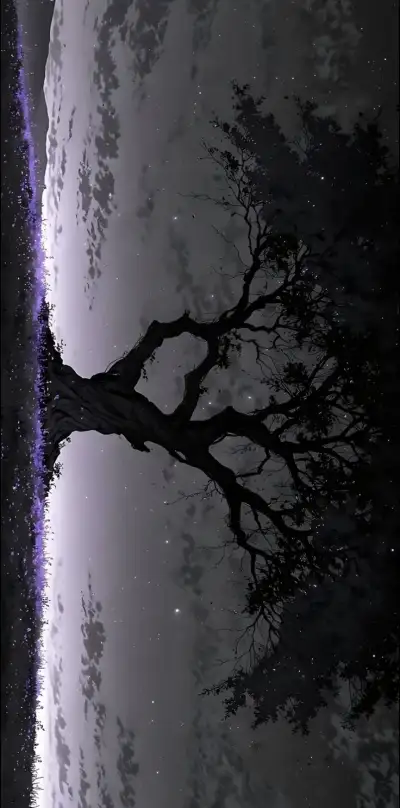 a tree with no leaves in front of a sky filled with stars and the moon