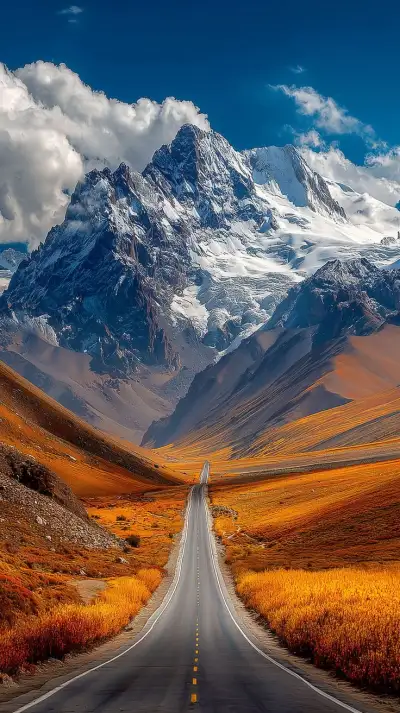 an empty road in the middle of nowhere with mountains in the background and snow - capped peaks