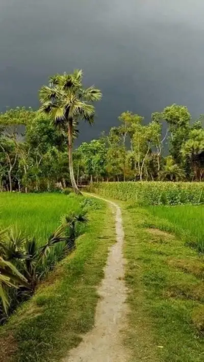 a dirt road in the middle of a lush green field with palm trees on both sides
