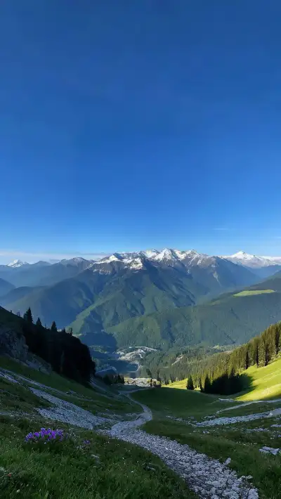 a path in the middle of a green valley