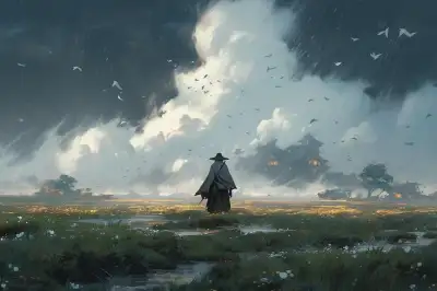 a man standing in the middle of a field under a cloudy sky with birds flying overhead