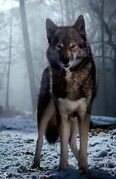 a wolf standing in the middle of a snow covered field with trees and fog behind it