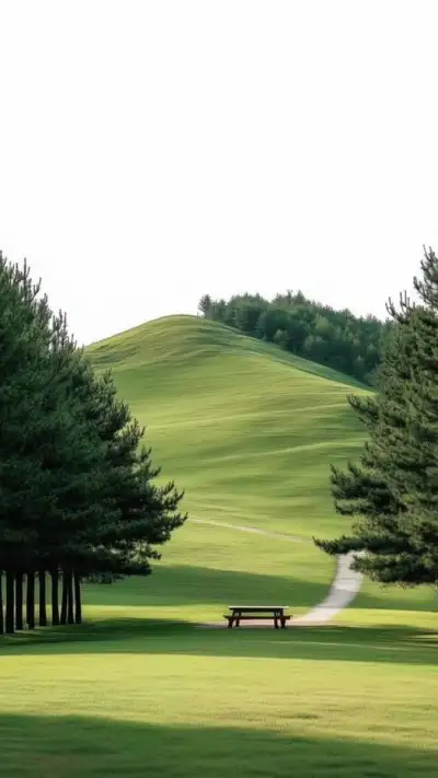 a park bench sitting in the middle of a lush green field next to tall trees