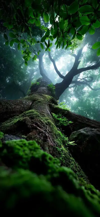 a mossy tree in the middle of a forest with sunlight coming through it's branches
