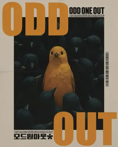 an advertisement for odd one out with a yellow bird in the middle of black birds