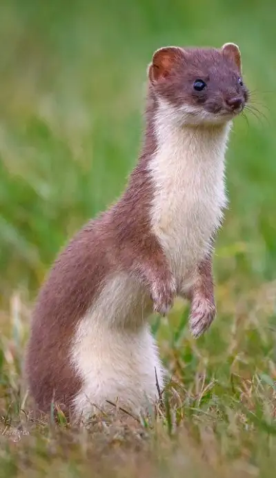 a small ferret standing on its hind legs in the middle of a grassy field