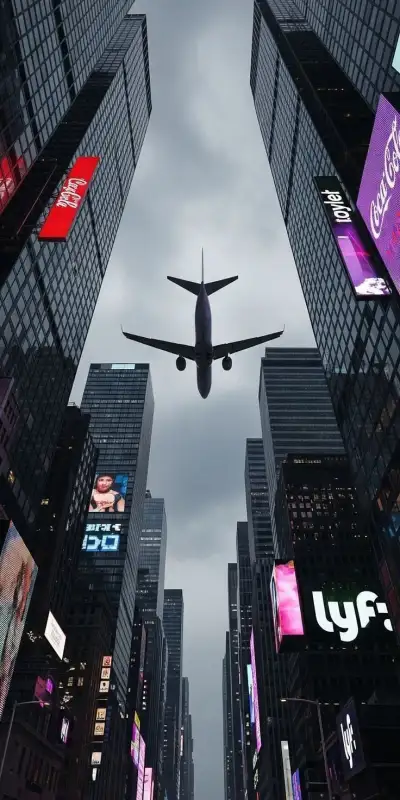 an airplane is flying through the air over some buildings and billboards in new york city