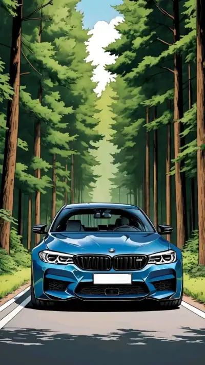 a blue car is driving down the road in front of some tall trees and green grass