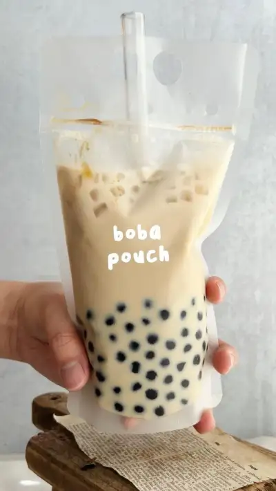 someone holding up a bubble tea bag with the word boba pouch printed on it