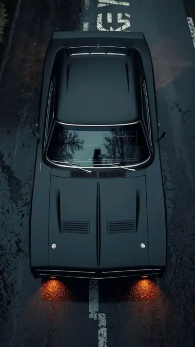 an overhead view of a black sports car parked on the side of the road with its lights on