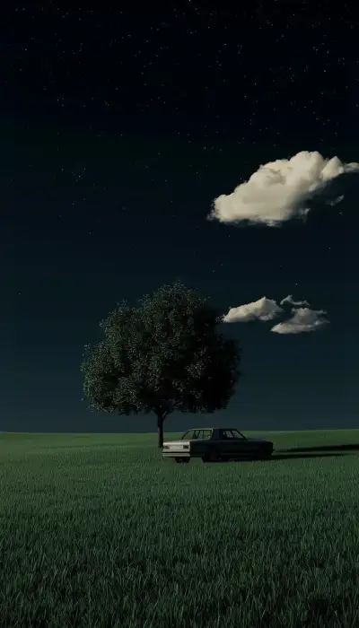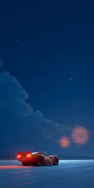 a blue sports car parked in front of a building under a night sky with stars and clouds